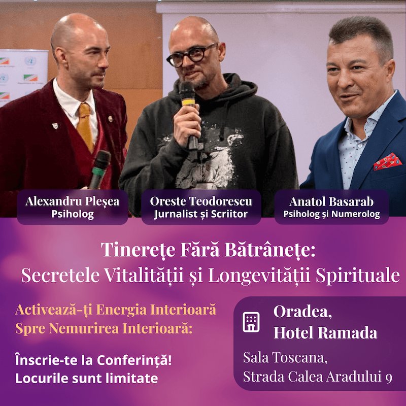 Alătură-te conferinței susținute de Alexandru Pleșea, psiholog și trainer dedicat optimizării condiției umane, Anatol Basarab, psiholog și numerolog de renume internațional, specialist în psihologie psiho-energo-informațională și cercetător în domeniul energiilor subtile, și Oreste Teodorescu, jurnalist, scriitor și realizator de emisiuni, cunoscut pentru preocuparea sa pentru spiritualitate, sănătate și cunoaștere holistică.